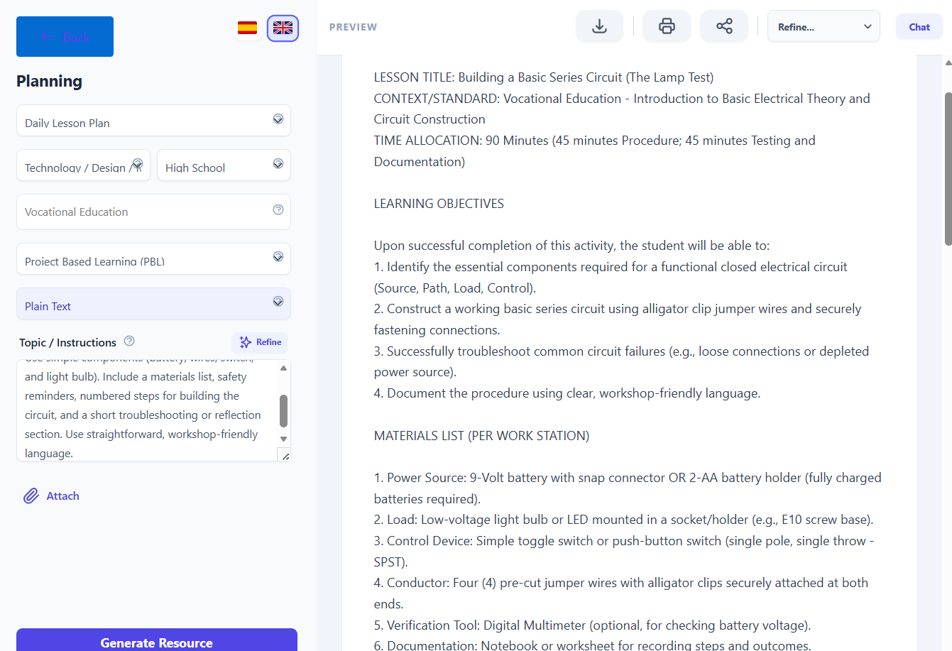 3. Tag it as “Electrical Circuit – Vocational – Daily Plan” for future use.
