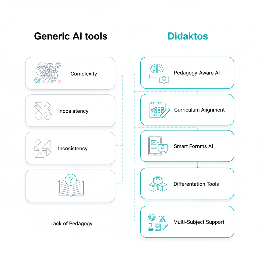 Didaktos was created with a simple mission: to empower teachers with intelligent, practical tools that save time, reduce stress, and elevate the quality of learning in every classroom. We believe educators deserve technology that understands their reality—not generic AI, but a platform built specifically for teaching.